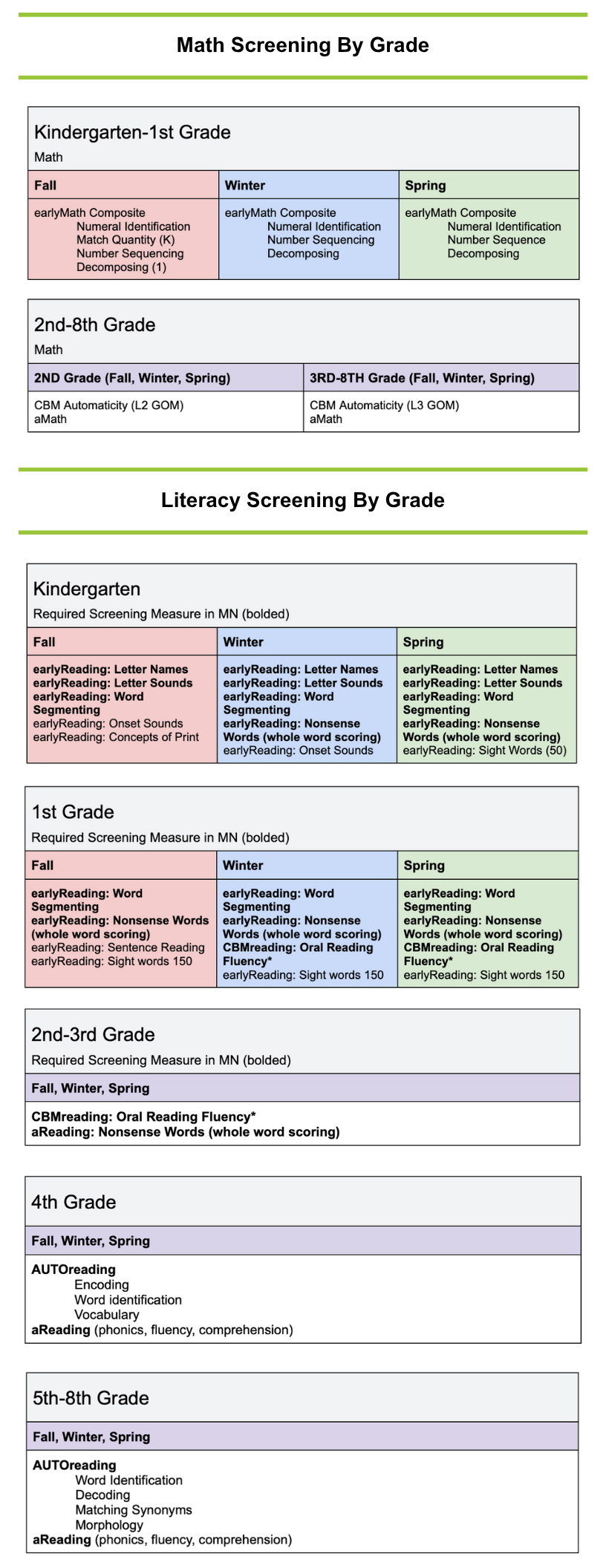 We screen all K-8 students to identify early if a student may benefit from extra support–so we can intervene proactively rather than reactively. We screen all students so that we can be intentional and individualized in our instruction as well as monitor student growth throughout the year.